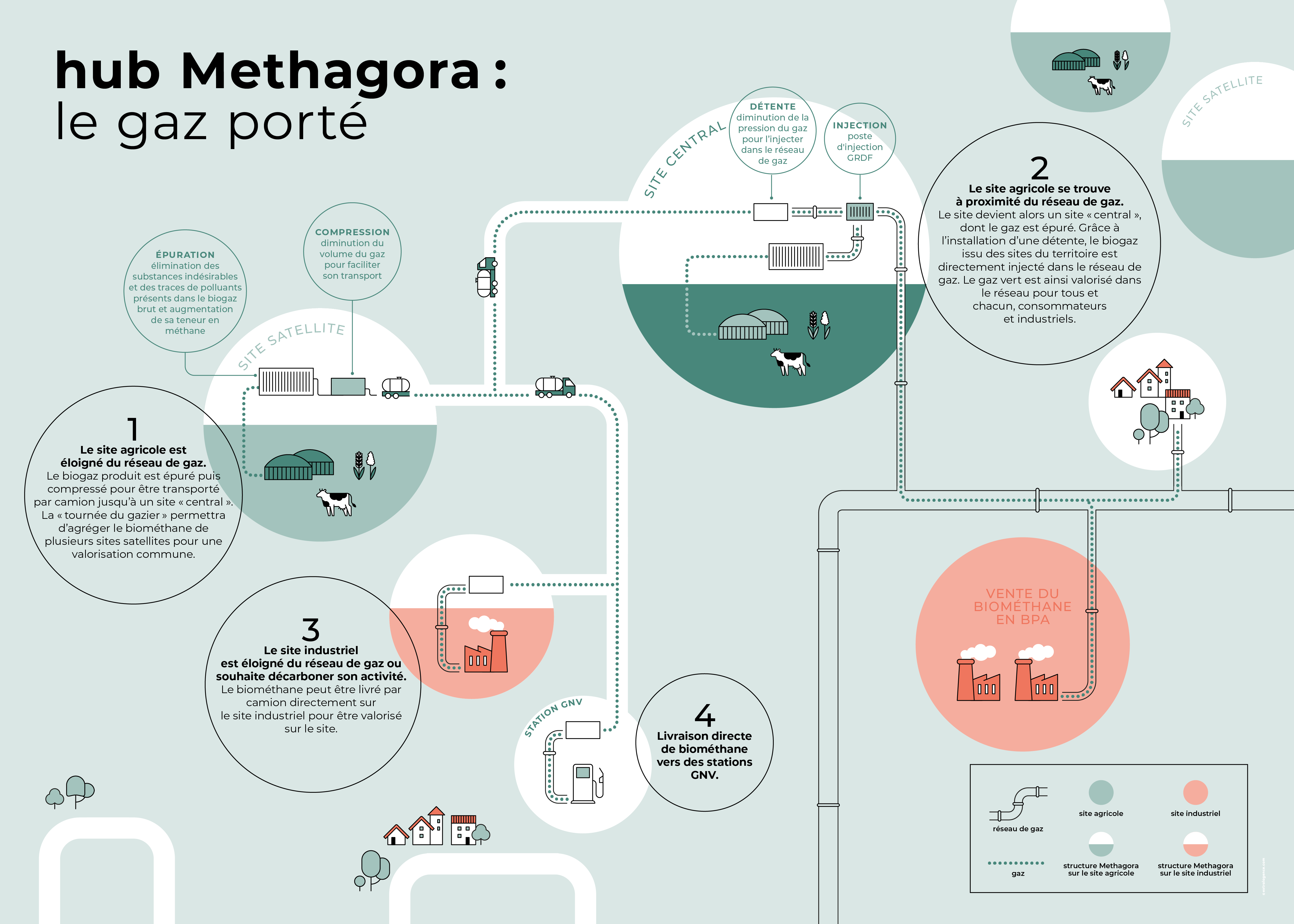 Porté par le Groupe Seya, Methagora est un expert dans la méthanisation agricole qui donne accès à la production de biométhane au plus grand nombre via deux concepts : - Le gaz porté : nous raccordons les unités de production de biogaz, où qu’elles soient, au réseau de gaz naturel. - La commercialisation de biométhane, hors obligation d’achat : nous proposons de nouvelles perspectives aux installations existantes. Methagora travaille avec les agriculteur·rices et les industriels vers un modèle convergent de transition énergétique : nous achetons du biogaz, le transformons en biométhane et le commercialisons à différents publics. Methagora a développé le concept innovant de gaz porté, repensant le modèle du biogaz. Tout site de cogénération peut être converti en unité de production de biométhane, sans contrainte de localisation du réseau. Le gaz vert de ces sites est regroupé sur un méthaniseur connecté au réseau de gaz naturel, le tout forme un réseau territorial : le « Hub Methagora ». Avec ce modèle, il est également possible de livrer du biométhane, en direct, à des industriels souhaitant décarboner leur activité. Methagora porte l’investissement matériel, la logistique, et mutualise les productions pour une commercialisation globale.