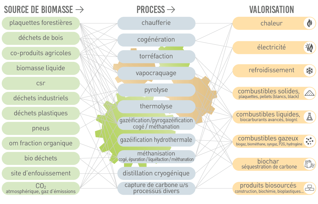 Les procédés industriels, les procédés de production d'énergie et le DAC sont les principaux points d’entrée pour la capture du CO2 qui peut ensuite être réaffecté ou extrait de l'atmosphère et transformé en une gamme de produits utiles au quotidien tels que les produits agricoles et chimiques, les matériaux de construction, les carburants de synthèse.