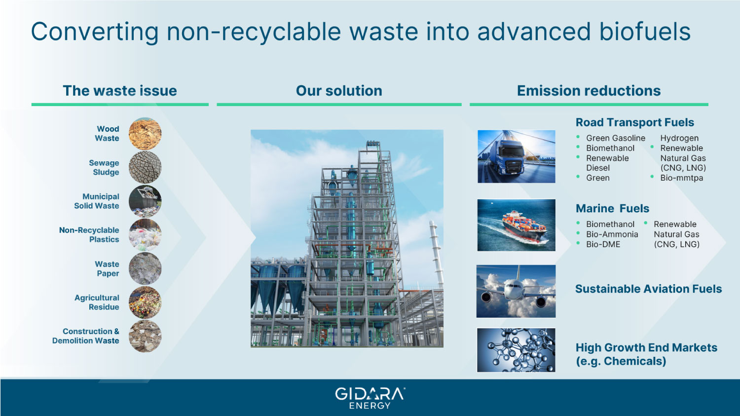GIDARA Energy is focused on converting non-recyclable waste into advanced biofuels by using patented technologies. Our High-Temperature Winkler (HTW®) technology can be utilized to produce valuable products such as advanced biofuels for use in the road transport, marine and aviation sectors, helping these sectors to reduce their carbon emissions and become more sustainable.